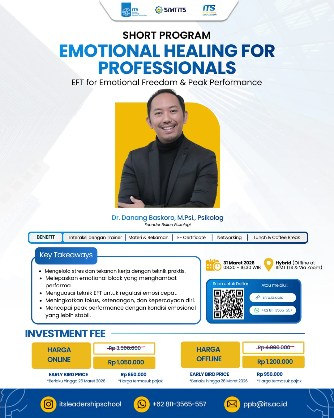 Sering Merasa Lelah Secara Mental, Meski Pekerjaan Fisik Tidak Seberapa? Emotional block yang tidak teratasi seringkali menjadi penghambat utama puncak performa Anda di dunia profesional. ITS Executive Education menghadirkan pelatihan "Short Program : Emotional Healing for Professionals - EFT for Emotional Freedom & Peak Performance". Melalui teknik EFT, Exceez akan belajar meregulasi emosi dengan cepat untuk mengembalikan fokus dan ketenangan dalam hitungan menit. Dipandu langsung oleh Dr. Danang Baskoro, M.Psi., Psikolog, pakar yang memahami dinamika psikologi kaum profesional.