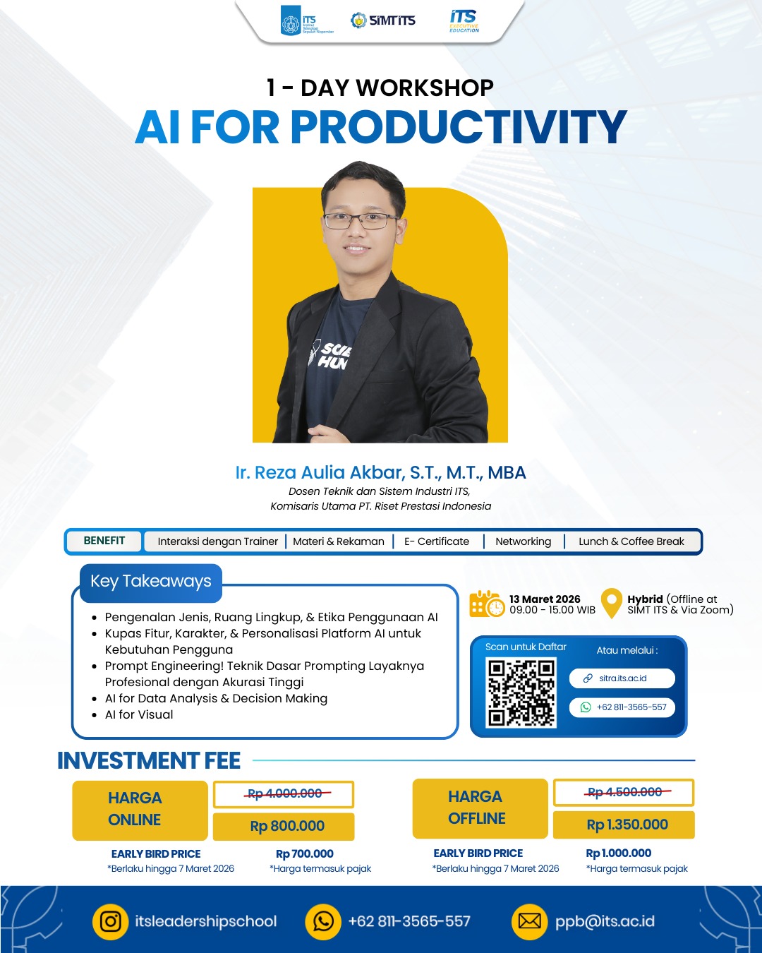 1-Day Workshop AI for Productivity dirancang membantu Anda memanfaatkan AI secara praktis untuk mempercepat pekerjaan dan pengambilan keputusan.
